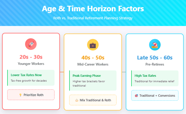 Younger Workers (20s and 30s): Generally benefit more from Roth contributions because they typically have lower incomes (and tax rates) now, plus decades for tax-free growth to compound. Even if they’re in higher tax brackets later in their careers, the long-term tax-free growth often outweighs the immediate tax savings of traditional contributions.