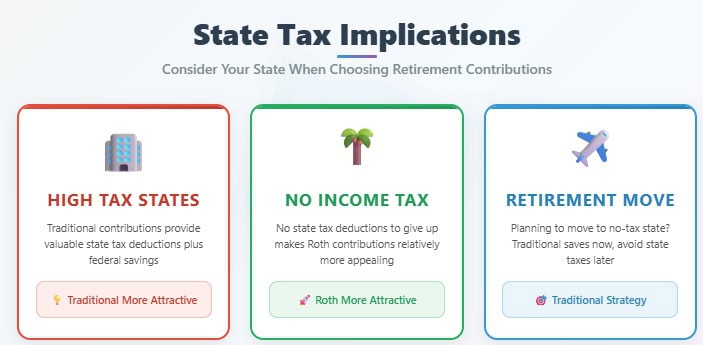 Retirement State Planning: If you plan to move to a state with no income tax in retirement, traditional contributions might be more valuable since you’ll avoid state taxes on retirement withdrawals.