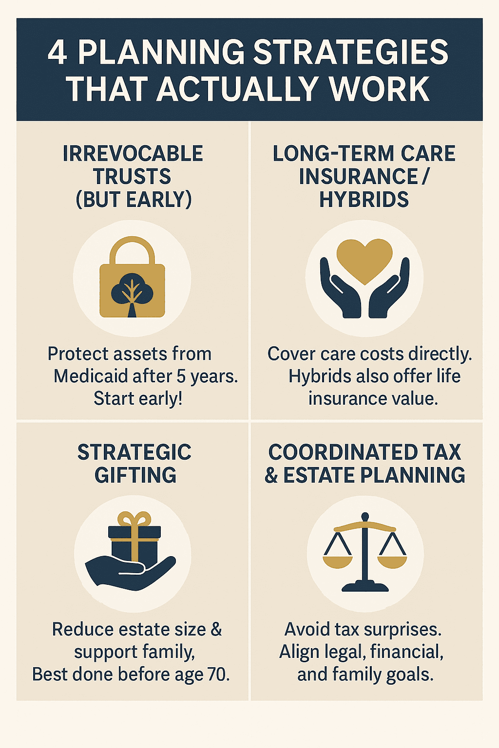 If supporting children or grandchildren is part of your plan, early gifts may reduce your taxable estate while giving you flexibility. Doing this before age 70 gives a longer cushion against potential care needs.