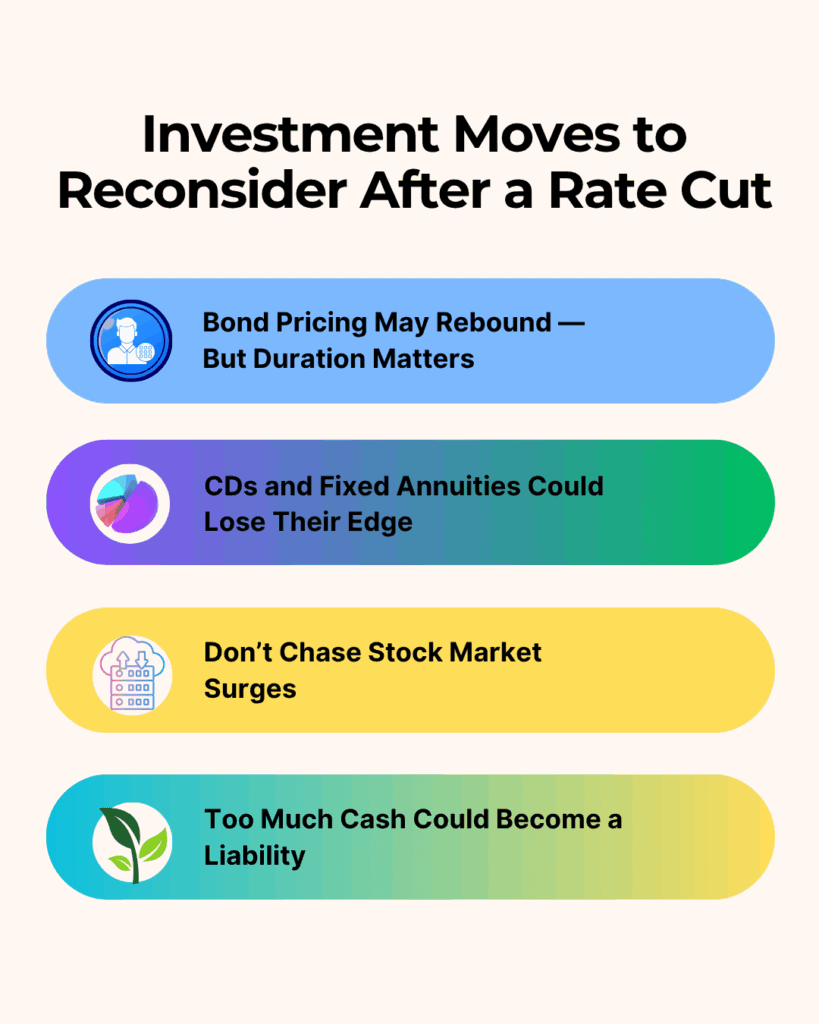 - Bonds and fixed-income behave differently: When rates fall, existing bonds (especially longer-dated ones) often rise in value. But if you’re holding very short-term bonds or cash equivalents, you may not benefit from that rebound.