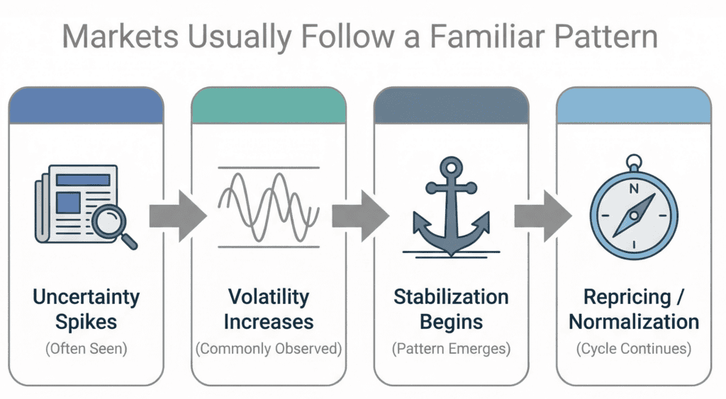 First comes the immediate selling; investors price in uncertainty quickly. Then volatility spikes as the news cycle accelerates. Defensive assets like high quality bonds tend to stabilize first. And gradually, as clarity improves, markets begin separating long term economic reality from short term fear.