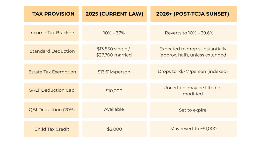 Unless Congress passes new legislation, many of the tax breaks enacted under the 2017 Tax Cuts and Jobs Act (TCJA) are scheduled to expire on January 1, 2026. This sunset will impact everything from income tax brackets to estate tax thresholds.